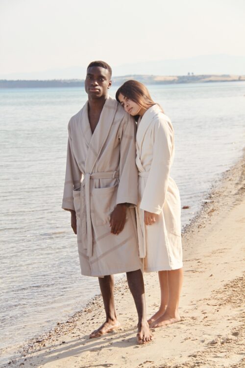 Fitted unisex Marin bathrobe with belt in WAYs signature terry fabric with a woven surface and soft terry on the inside. The coat-inspired bathrobe has maxi front pockets to carry all of your personal belongings and your long vacation bucket lists.