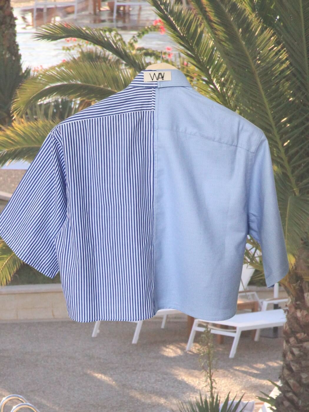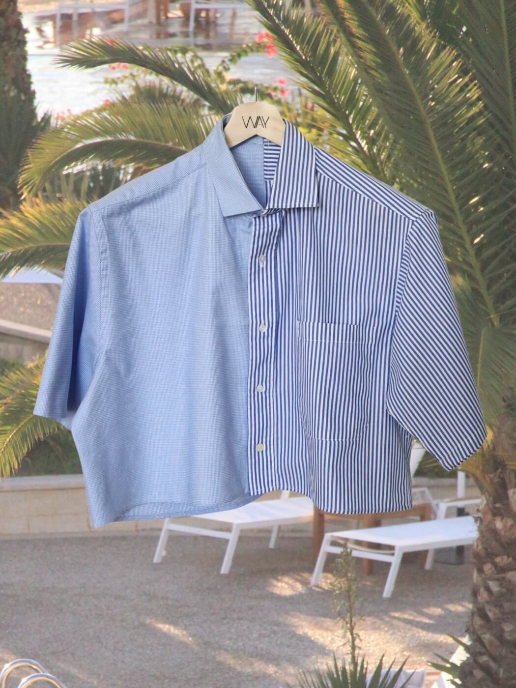 Cropped shirt with short sleeves for relaxed days in the sun, lunch at the beach house or drinks by the pool. Made from two carefully selected upcycled men’s shirts in sizes L-XXL with high attention to detail. The ultimate unique summer top.